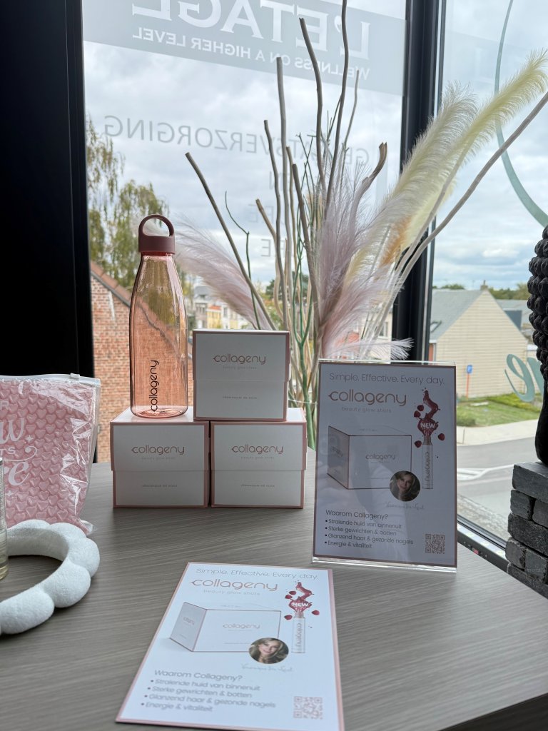 Vanaf nu verkrijgbaar in de zaak: 'Collageny beauty glow shots by Véronique De Kock'.